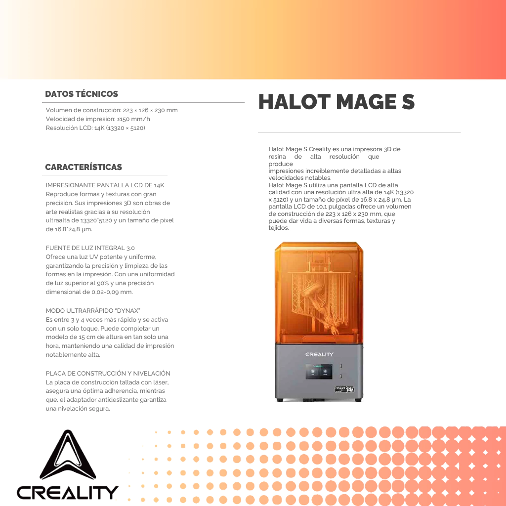 Descubre la Impresora 3D resina Creality Halot Mage S , la herramienta perfecta para llevar tus proyectos de impresión a un nuevo nivel. Con su impresionante resolución de , podrás obtener detalles asombrosos en cada uno de tus modelos.